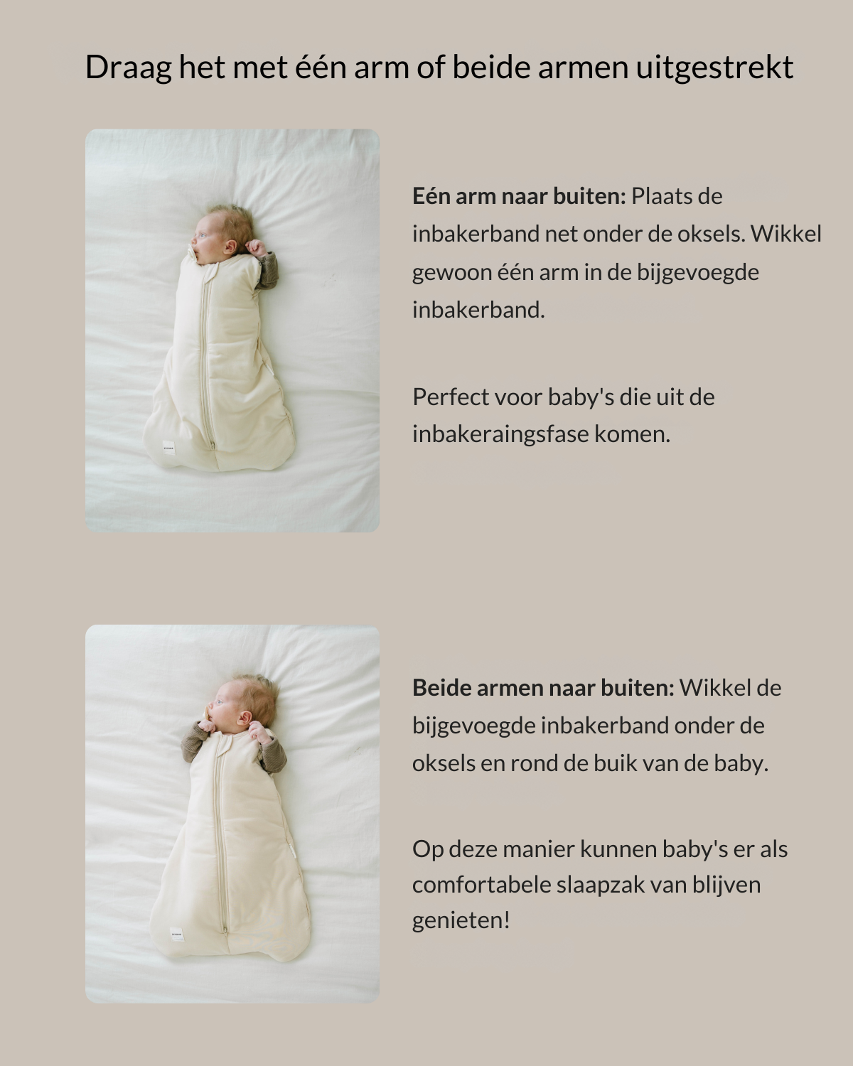 • 3 draagopties: Omdat elke baby uniek is. Het aanpasbare ontwerp maakt het mogelijk om beide armpjes in te bakeren voor pasgeborenen, één armpje uit voor een rustige overgang, en beide armpjes uit voor zelfstandige slapers — de perfecte balans tussen geborgenheid en vrijheid.