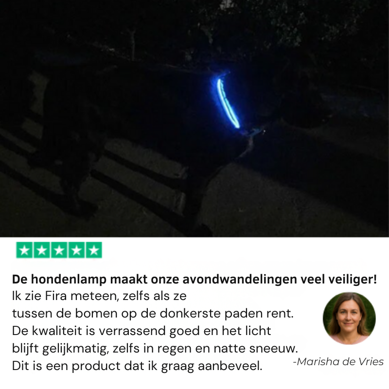 U houdt de riem in uw hand en ziet de autolichten naderen. Uw hart slaat een slag over. Op dat moment wilt u maar één ding: dat uw hond gezien wordt.