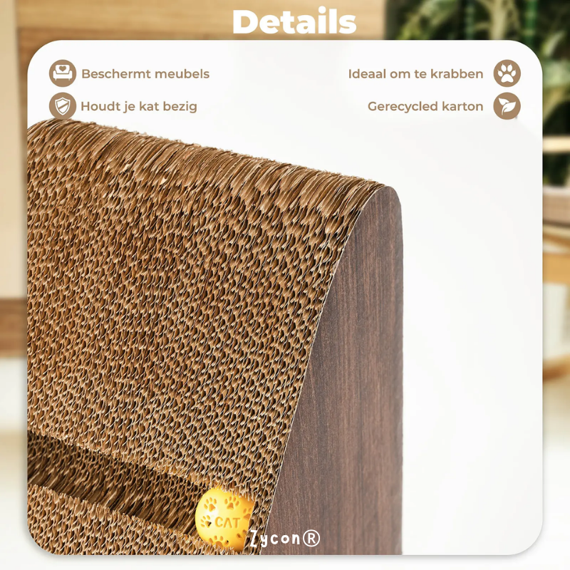 Onze kartonnen krabpaal heeft een onweerstaanbare textuur en geur voor katten. Het dubbelzijdige ontwerp zorgt voor een langere levensduur, waardoor deze krabpaal een duurzame keuze is. Het natuurlijke kraboppervlak helpt de nagels van uw kat in topconditie te houden.