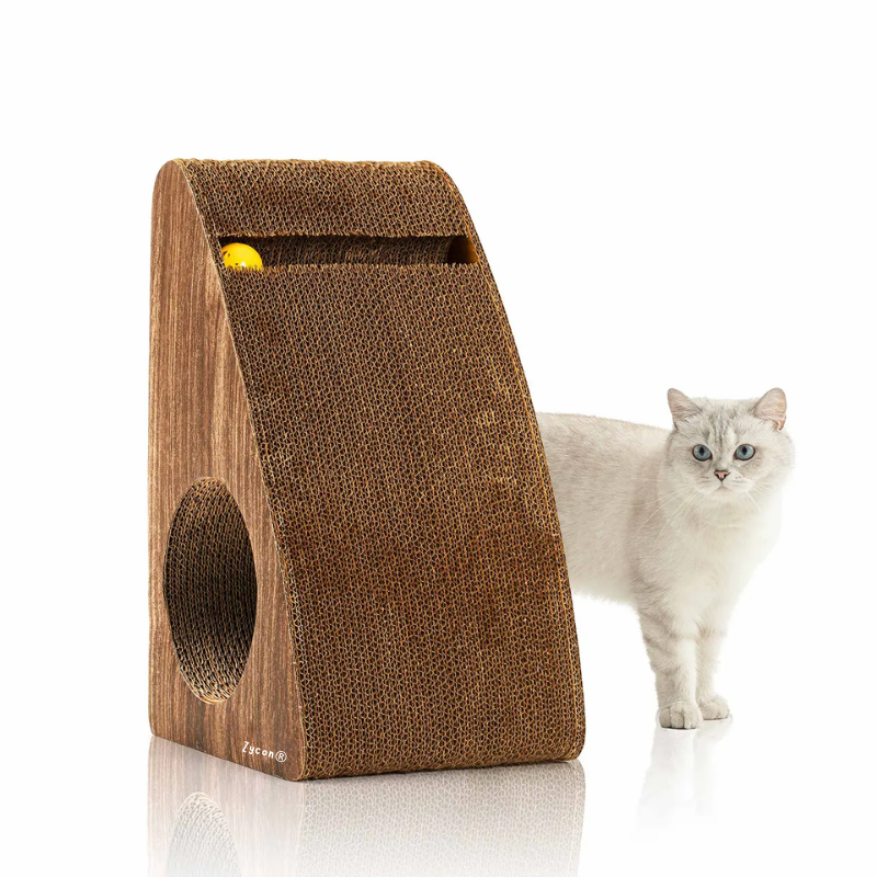 Designer krabpaal als alternatief voor een kattenkrabpaal. Inclusief speelgoed en kattenkruid. Dit speciale driehoekige model biedt uitdagende klimervaringen en een tunnel waar katten doorheen kunnen rennen, spelen of rustig slapen.