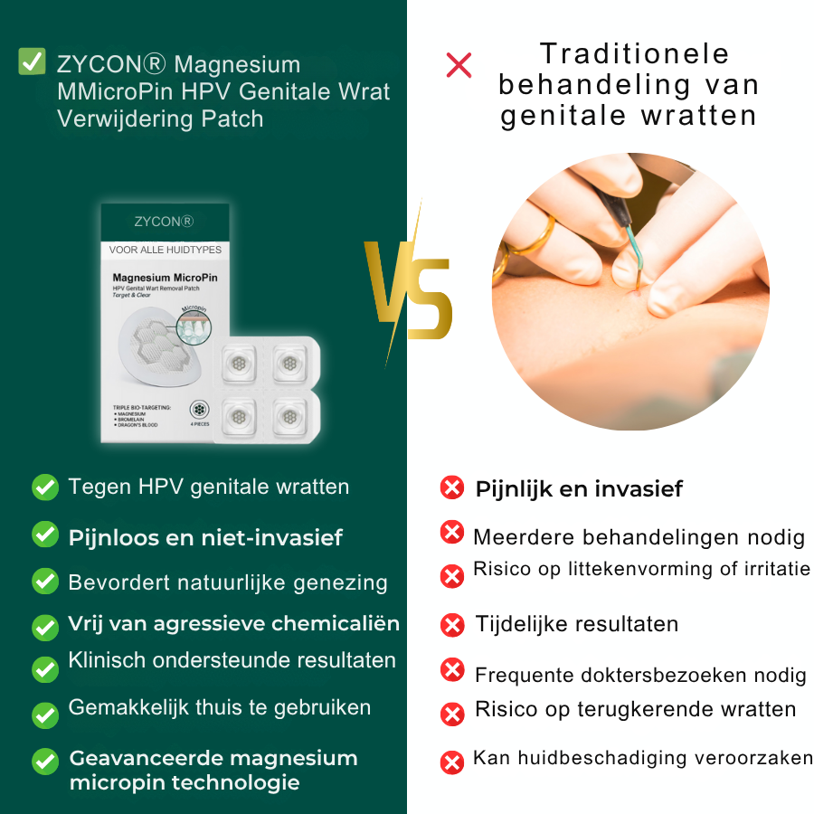In tegenstelling tot traditionele behandelingen die alleen zichtbare wratten verwijderen, gaat Zycon® dieper om het HPV-virus bij de bron aan te pakken, waardoor het minder vaak terugkomt en de hoofdoorzaak wordt aangepakt.